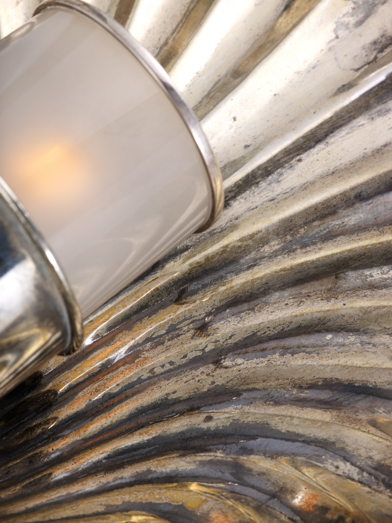 The Clandon Light is a beautifully sculpted oyster shell. The sculpted ripples of our Clandon wall light are perfectly formed from hand-hammered brass and delicately render multiple reflections of the light source. Shown here in Antique Silver, the light is available in a range of metal finishes.
