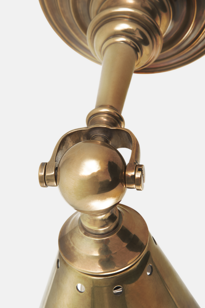 The Clipper Task Light has been inspired by industrial lighting of the past century. The main body is machined from solid brass and the spun shade can specified with pierced holes. The Clipper’s back plate has been engineered to have invisible fixings and can also be supplied specially adapted for mounting on a library bookcase. Shown in Antique Copper but is available in any of Collier Webb's standard finishes