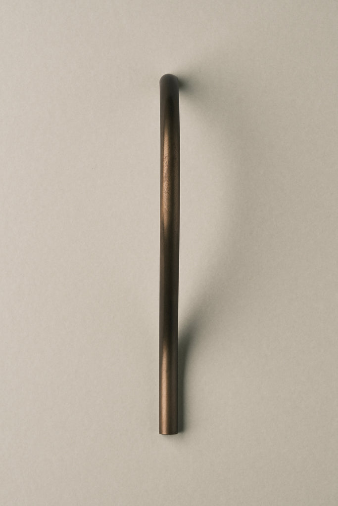 A prominent handle with an elegantly slanted curve, this larger handle is beautiful as a statement piece on tall cabinet doors complementing smaller handles or knobs in a kitchen, and amazing when paired or repeated on wardrobe doors. Thanks to its size and stable character, Doyen is a suitable handle for built-in refrigerators/freezers. The matte finish has a natural looking aged appearance in a deep burnished tone.