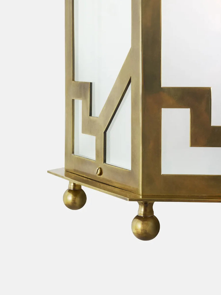 The Steppe Lantern is undeniably Deco-inspired and is complimented by the smaller Steppe Wall Light. It is supplied with one metre of hanging chain but can also be adapted for table mounting. Crisply created from hand pierced brass sheet, the design creates a distinctive silhouette over the frosted glass panels. Shown here in Antique Brass but available in any of Collier Webb's standard finishes.