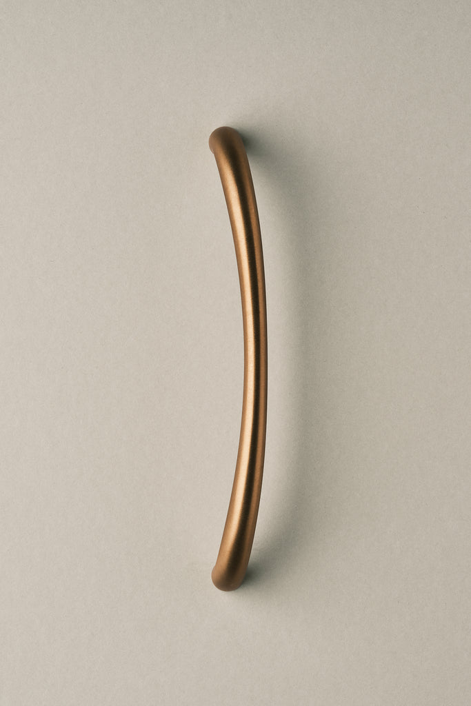 SUAVE is a charming handle with a subtle yet elegant design. It curves slightly off centre creating an intricate and dynamic slant. This versatile handle is perfect for big drawers and cabinets as well as built-in dishwasher and refrigerator/freezer. Beautiful on closet doors and can be placed mirrored on paired doors. The matte finish has a natural looking aged appearance in a warm amber tone. Pairs well with BLUNT, TENDER & PRIM in AMBER BRASS. Designed in Sweden. Handmade in Florence, Italy.