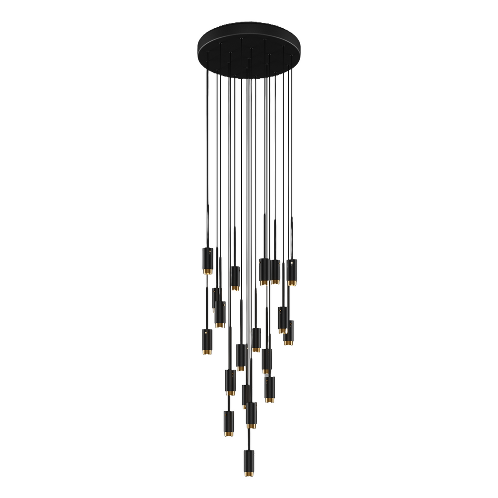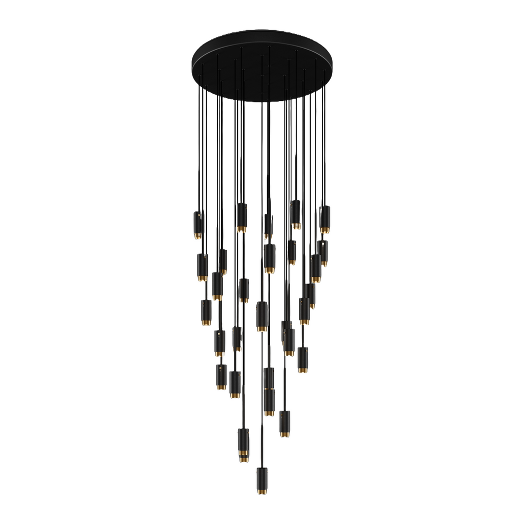 A bespoke cascade chandelier with either 10, 19 or 31 light pendants made from solid metal with Buster + Punch's signature linear-knurling. This chandelier features GRAPHITE powder coated EXHAUST lights and is powered by exposed LED exhaust bulbs to give a warm and ambient glow. Custom built to fit your space perfectly.