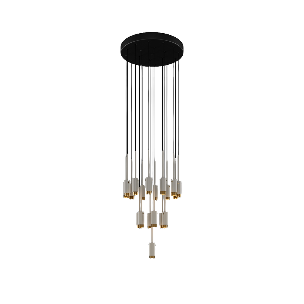 A bespoke classic chandelier with either 10, 19 or 31 light pendants made from solid metal with Buster + Punch's signature linear-knurling. This chandelier features STONE powder coated EXHAUST lights and is powered by exposed LED exhaust bulbs to give a warm and ambient glow. Custom built to fit your space perfectly.