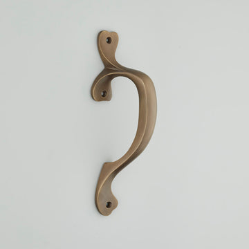 An intricately detailed curved pull handle made using high quality brass and shown here in an Antique Brass finish. Also available in a range of alternative finishes.
