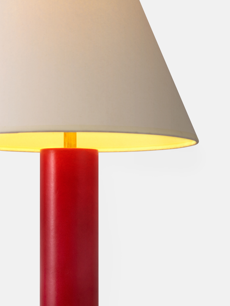 The handcrafted Lancel Light exudes timeless style. Its column and base are turned tulip wood, expertly wrapped in your choice of Collier Webb's eight fine grain leather options. The slim metal collar at the base of the column can be specified in any of their standard finishes. The Lancel can also be made to any bespoke size to suit your project perfectly. Shown here in Firebrick Leather with a Black Leather base and Polished Brass metal accents, topped off with a Snow White card shade.