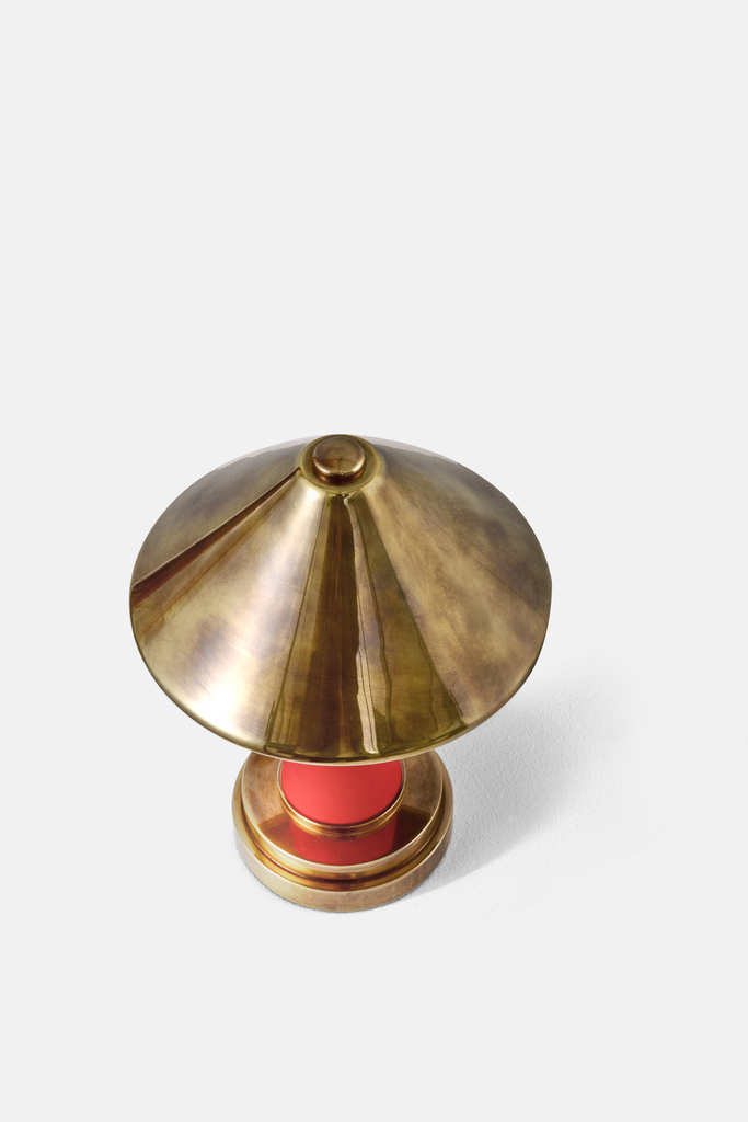 A small but perfectly formed cordless version of Collier Webb's best-selling “Shiitake” table lamp. This portable table lamp features all the finesse of its larger counterpart; a hand-spun brass coolie shade and a luxurious leather-wrapped stem. The Mini Shiitake is ideal for dining. Its wind-proof design also makes it the perfect addition to outdoor entertaining areas.