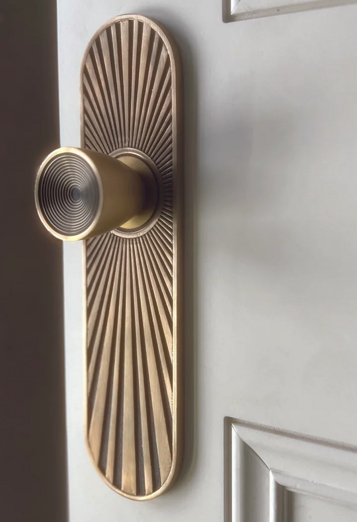 Philip Watts Design's first new handle for 2024, Sonne. Sonne is an Art Deco Sunburst/Sunshine/Sunrise inspired lever handle both in design and name (Sonne is German for sun). Sonne is shown here cast in brass. Sonne handles are supplied with a satin brushed polish and aged patina. As this is a made to order piece, other finishes may be available upon request.