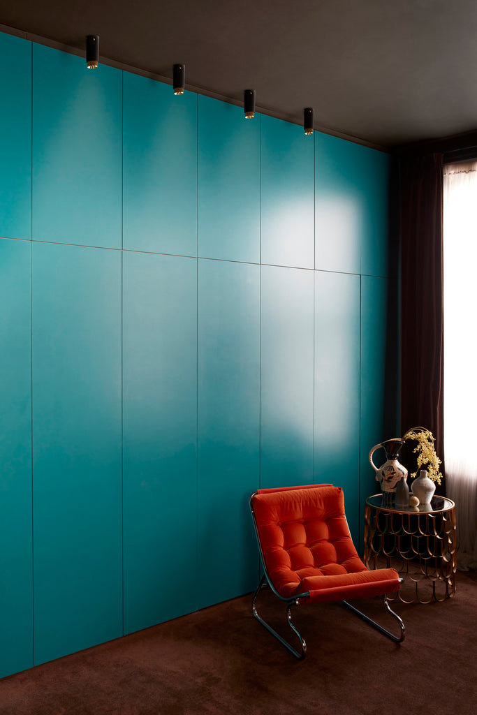 A surface mounted, fixed spotlight made from graphite powder coated metal with solid brass detailing. The spotlight features Buster + Punch's signature linear-knurl baffle and machined torx screws, both made from solid brass. The baffle captures light and creates a delicate metallic glow, whilst a honeycomb filter emits a precise, non-glare, directional spotlight.
