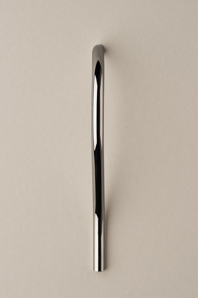 A prominent handle with an elegantly slanted curve, this larger handle is beautiful as a statement piece on tall cabinet doors complementing smaller handles or knobs in a kitchen, and amazing when paired or repeated on wardrobe doors. Thanks to its size and stable character, Doyen is a suitable handle for built-in refrigerators/freezers. The polished nickel plate has a warm tone and a smooth mirrored finish.