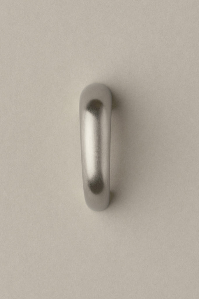 A sturdy design in a fluid and light proportion. The concave detailing on the inside adds a sensuous tactility. The Satin Nickel plate has a warm tone and a smooth satin matte finish. Beautiful placed vertically on both cabinets and drawers. Designed in Sweden. Handmade in Florence, Italy.