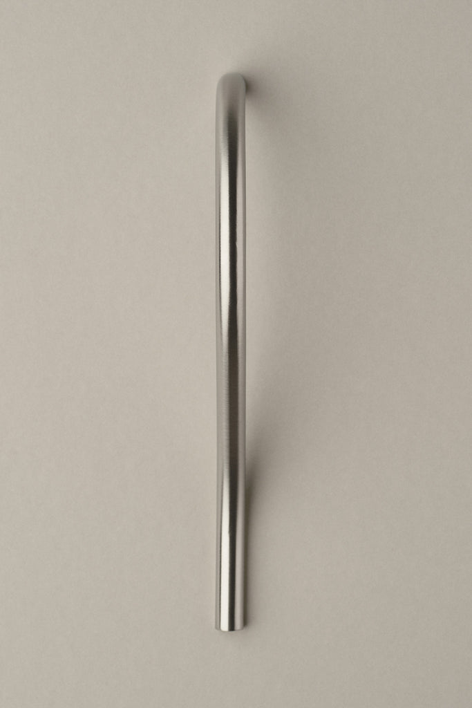 A prominent handle with an elegantly slanted curve, this larger handle is beautiful as a statement piece on tall cabinet doors complementing smaller handles or knobs in a kitchen, and amazing when paired or repeated on wardrobe doors. Thanks to its size and stable character, Doyen is a suitable handle for built-in refrigerators/freezers. The Satin Nickel plate has a warm tone and a smooth satin matte finish.
