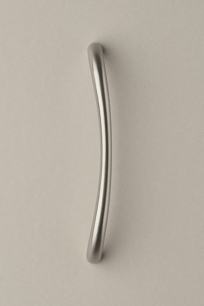 SUAVE is a charming handle with a subtle yet elegant design. It curves slightly off centre creating an intricate and dynamic slant. This versatile handle is perfect for big drawers and cabinets as well as built-in dishwasher and refrigerator/freezer. Beautiful on closet doors and can be placed mirrored on paired doors. The Satin Nickel plate has a warm tone and a smooth satin matte finish. Designed in Sweden. Handmade in Florence, Italy.