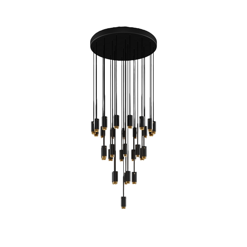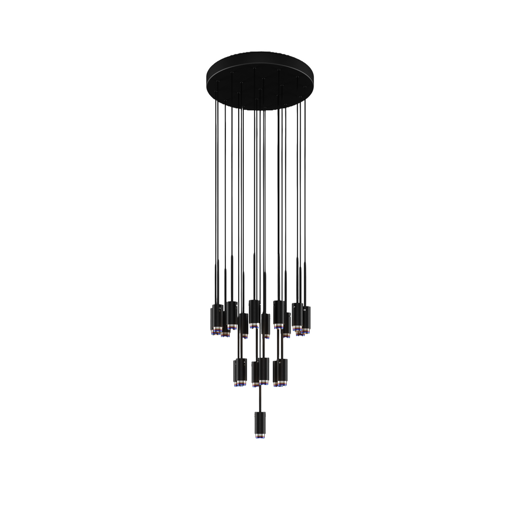 A bespoke classic chandelier with either 10, 19 or 31 light pendants made from solid metal with Buster + Punch's signature linear-knurling. This chandelier features GRAPHITE powder coated EXHAUST lights and is powered by exposed LED exhaust bulbs to give a warm and ambient glow. Custom built to fit your space perfectly.